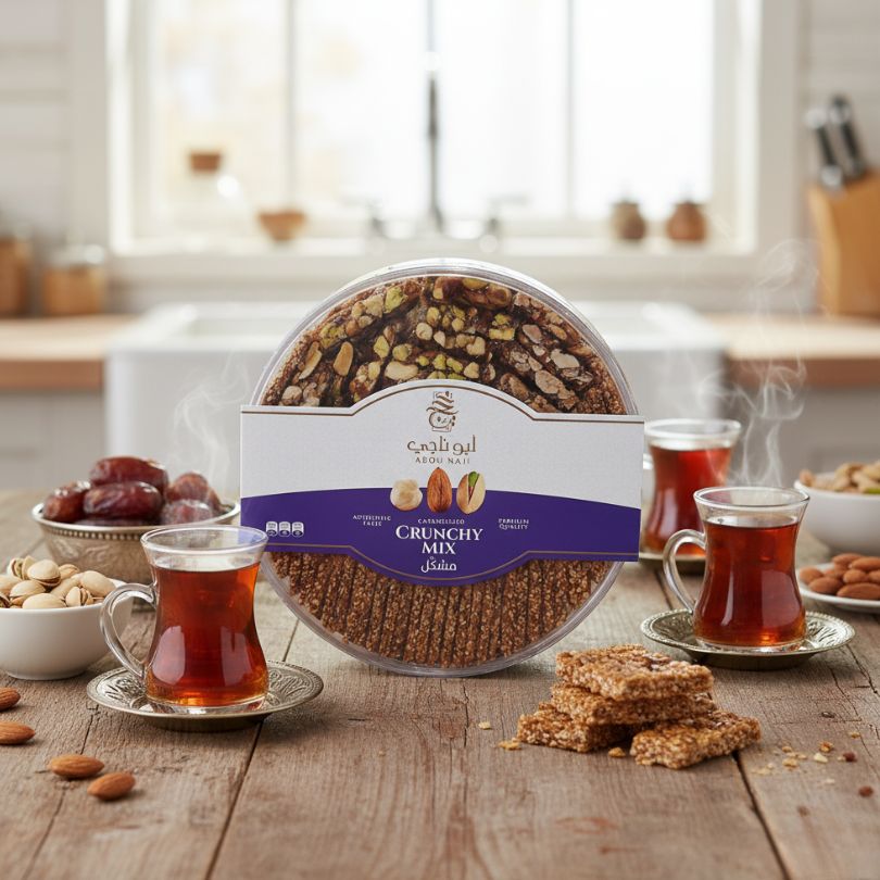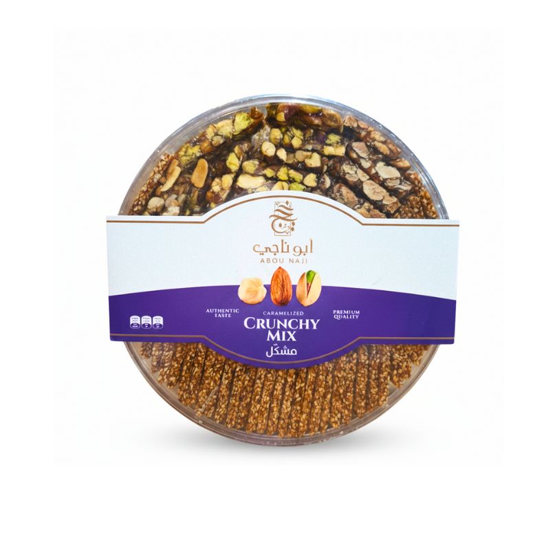 Disfruta la mezcla crujiente de Abou Naji: una combinación premium de frutos secos caramelizados como almendras, pistachos y semillas de sésamo. Su textura crocante y sabor intensamente aromático lo convierten en el acompañante ideal para compartir en familia, ofrecer a visitas o disfrutar con tu bebida favorita. Un toque auténtico de tradición oriental en cada bocado.
