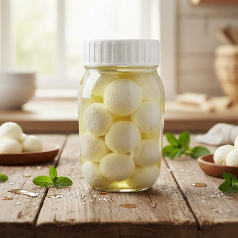 Conveniencia en Frasco: El frasco de vidrio mantiene las bolas de queso frescas y listas para usar. Solo drena ligeramente, ¡y sirve!